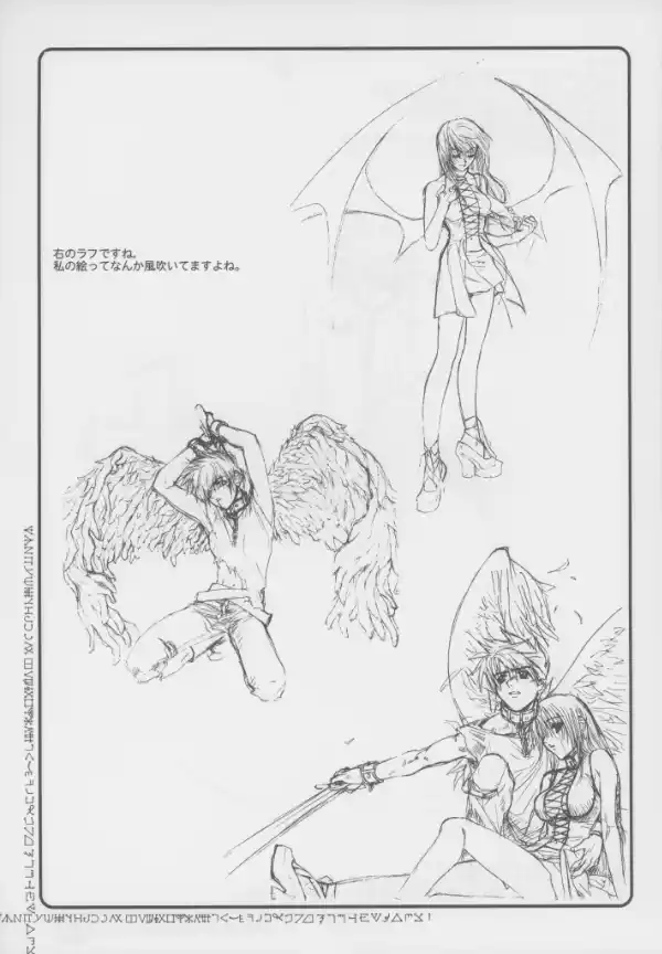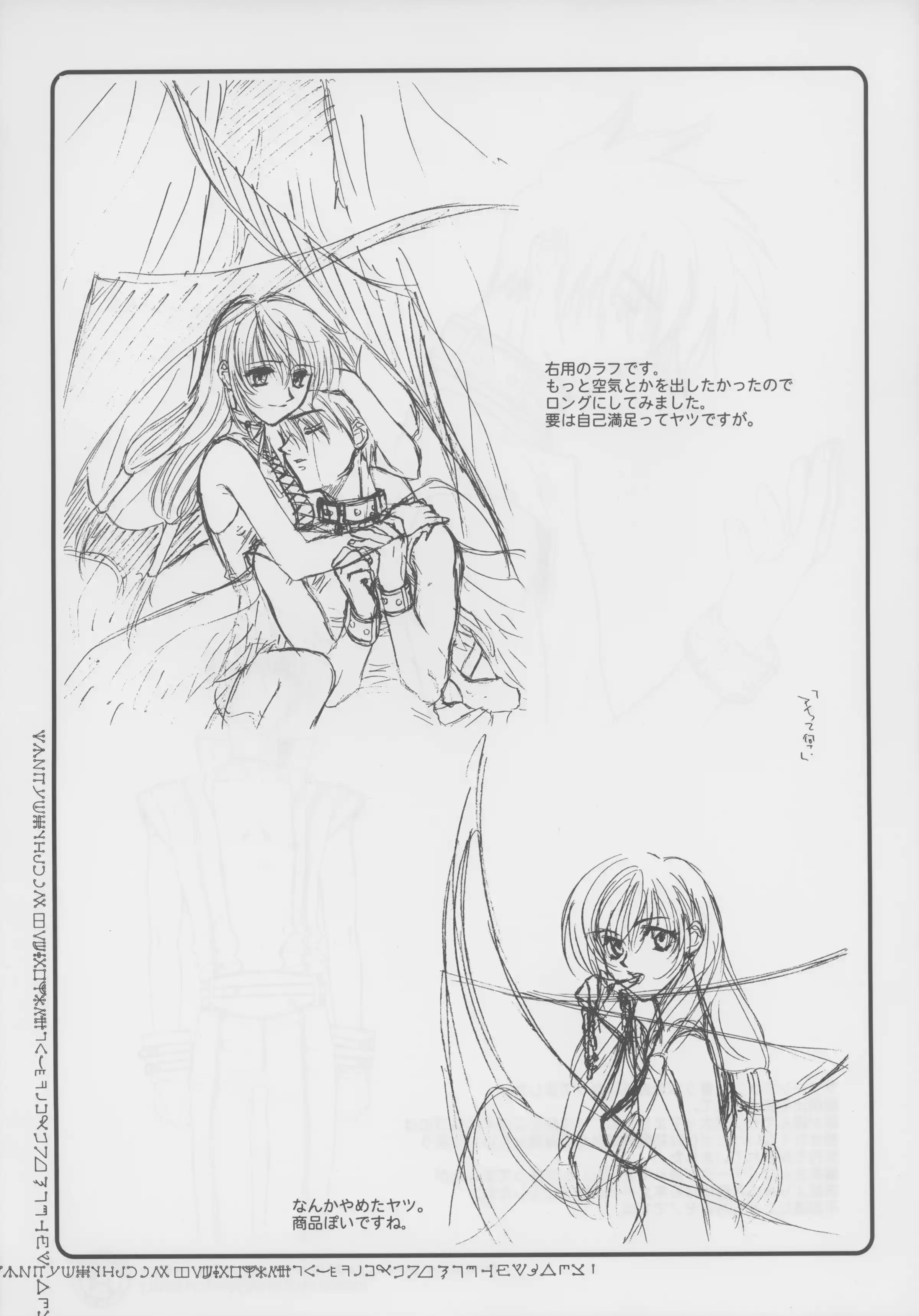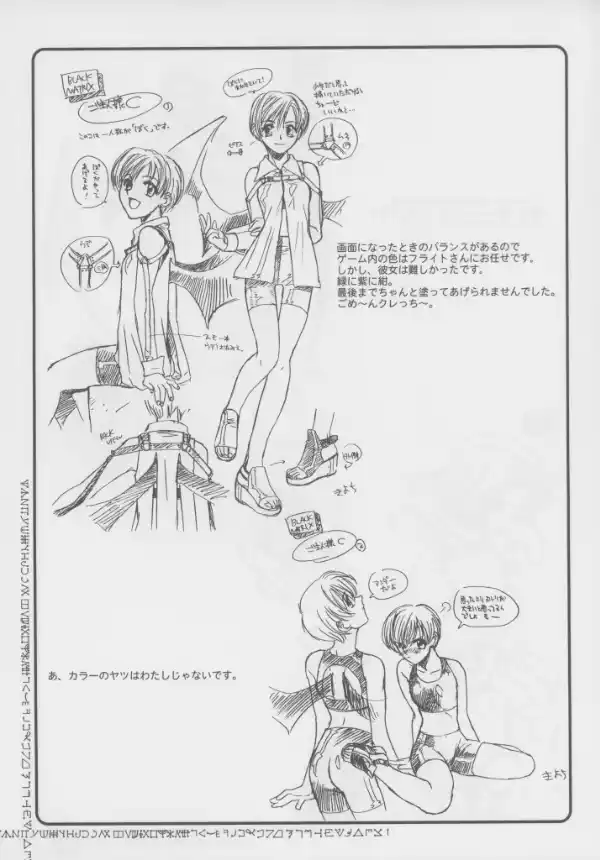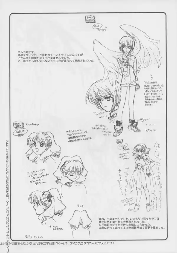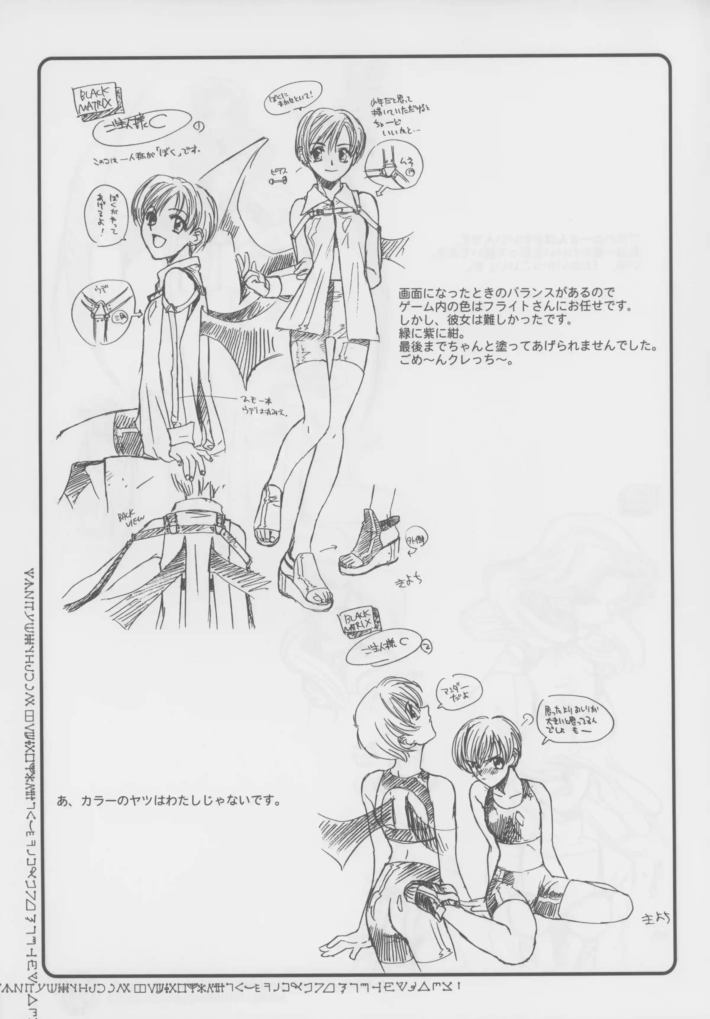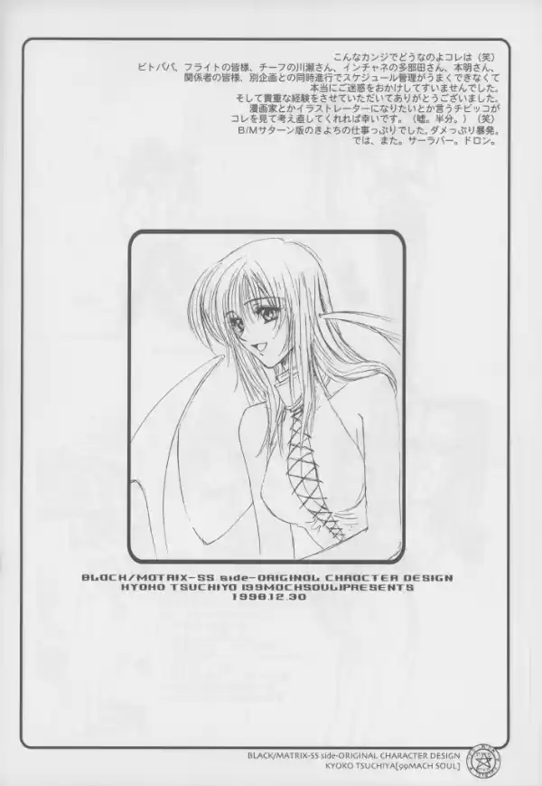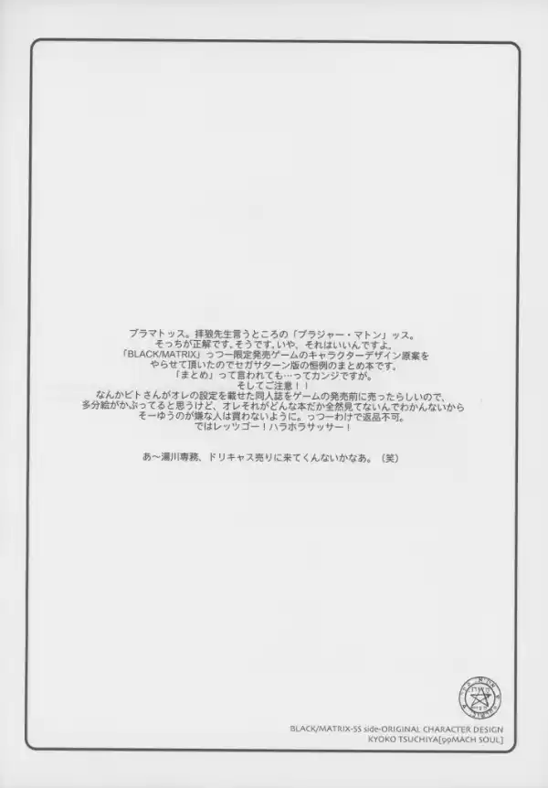 Tsuchiya signs out for good thanking Bito Gou, Flight-Plan, and all the folks she worked with in NEC Interchannel for giving her this opportunity, and for accommodating her scheduling as she was juggling Black Matrix character design work alongside another project (likely Weiss).