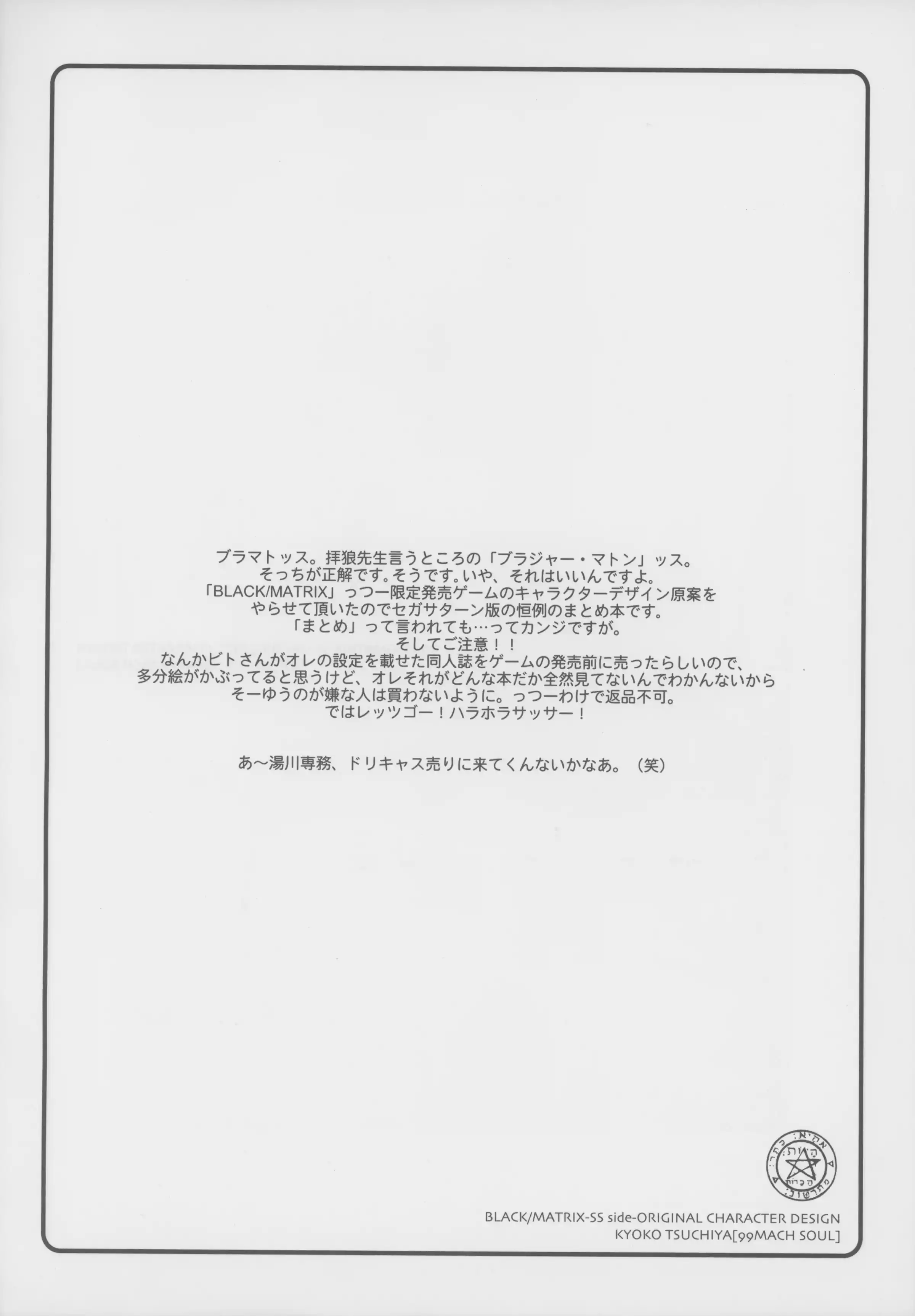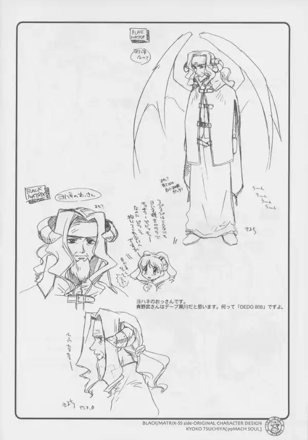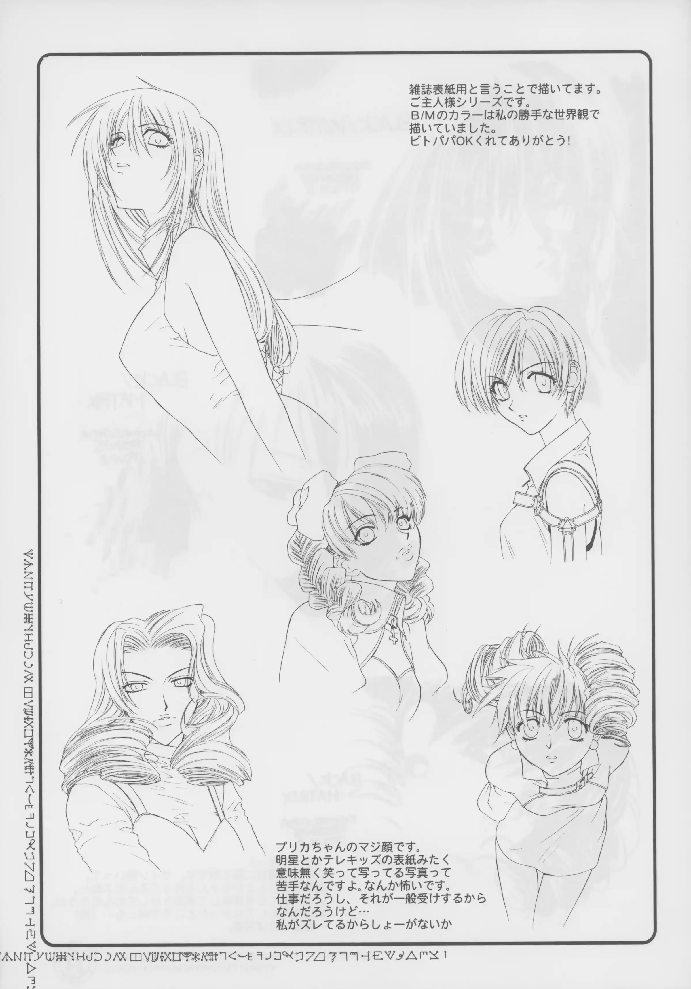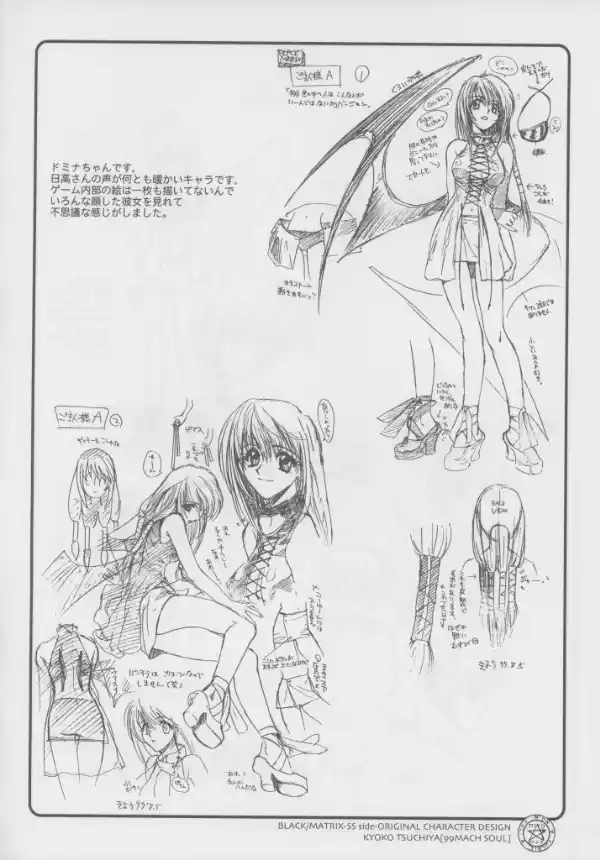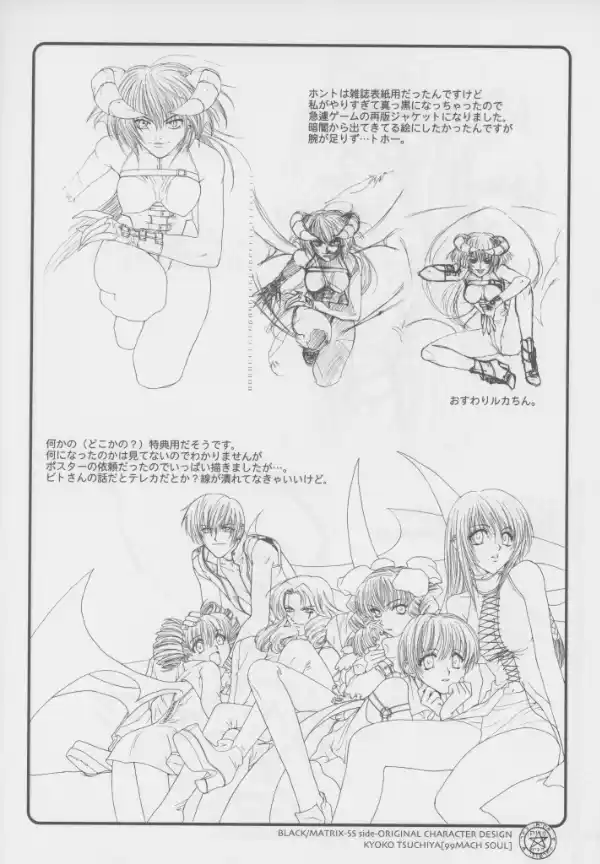 This work is a limited run doujin showing off line sketches and digitally coloured art that Kyoko Tsuchiya did as the character designer of Black Matrix, along with related works.