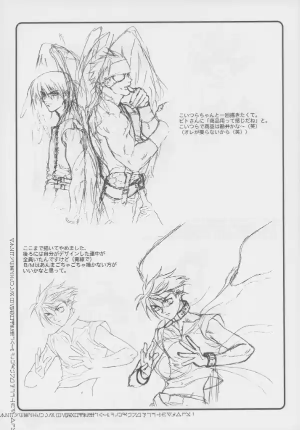 A few more roughs, including one of Gaius and Reprobus. A duo that Tsuchiya was happy to illustrate more of. The sketch of Abel summoning a sphere was done with the intent of having the full cast behind him, but Tsuchiya remarks that she shouldn't get carried away with working on Black Matrix.