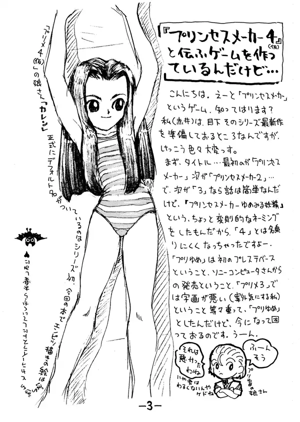 Three figures orbit about Karen in urban wear, including the bat avatar, presumably representing the planning staff for Princess Maker 4 at this time. Akai and Kimiko Higuchi are easy to recognize from past Gainax works, as they had similar appearances in the Princess Maker 2 Secret Book.