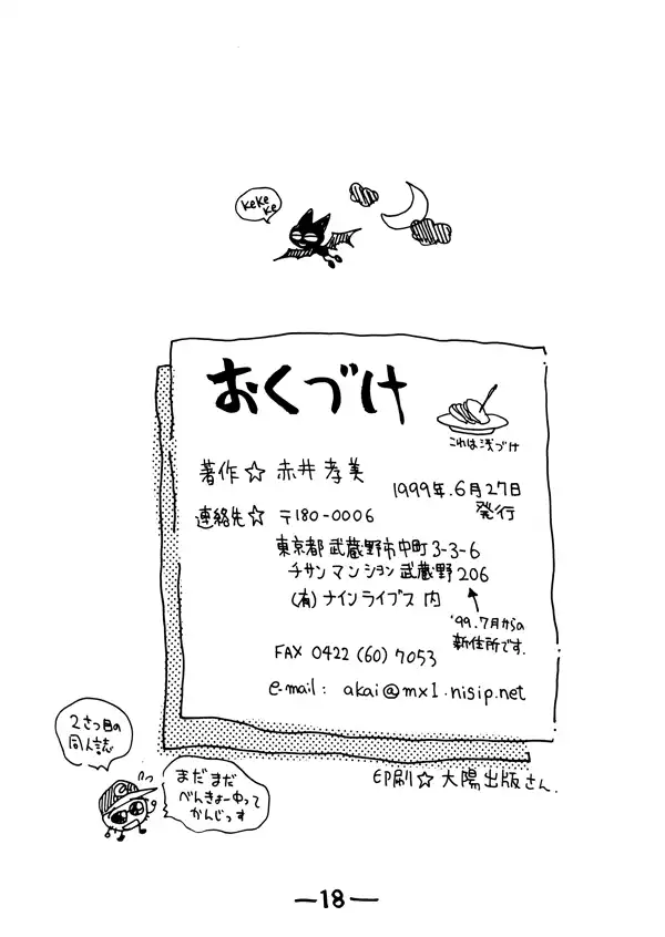 A new figure represented by a bat avatar credits themselves for turning sketches like the one on this page into "colour illustrations" (カラーイラス). This could be Akai's longtime collaborator Jun Tamaya, as Tamaya's traditional role in Ninelives staff was to be the digital colourist for Akai's sketches going back to Gainax's PC-88 games.