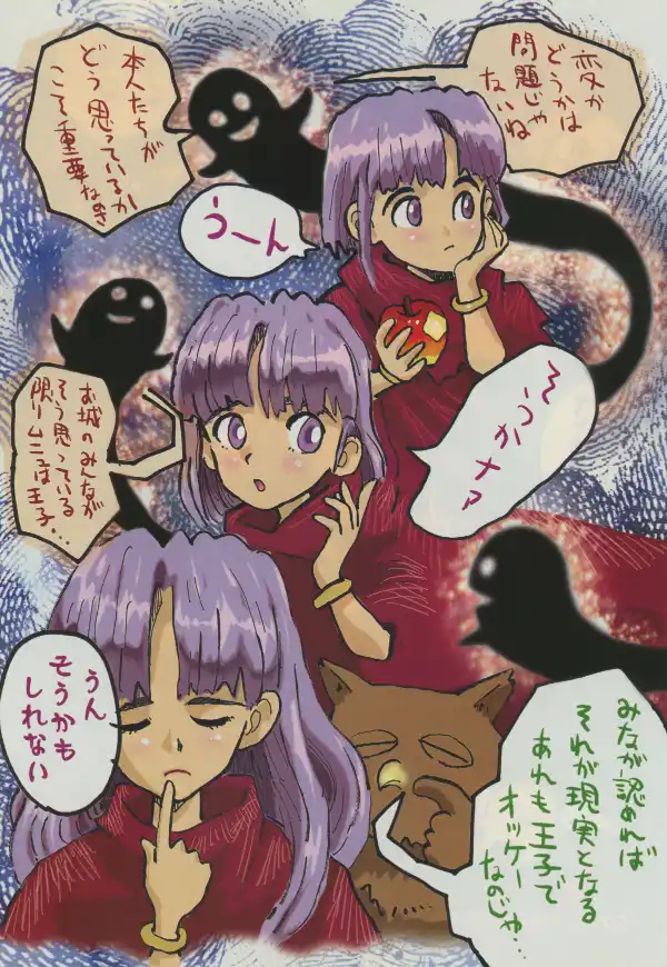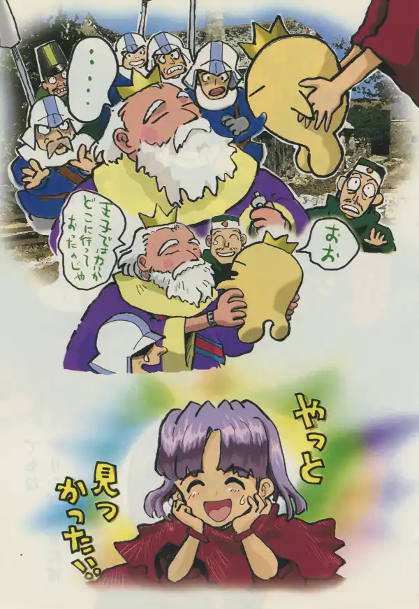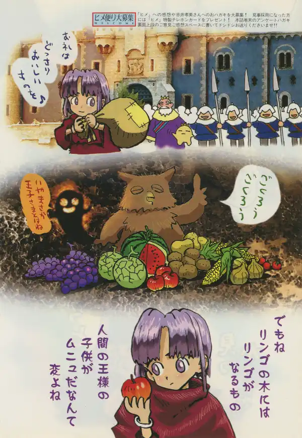 The first page gives the protagonist a Princess Maker cover-style glow up with royal robes in Akai's traditional style, before going all in on the new for 1998 style.